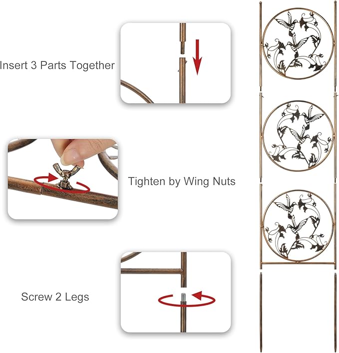 - Easy to Assemble: This pair of trellis is handcrafted and constructed of sturdy, it made from iron under a thick finish of bronze powder-coat. Easy installation is required, just insert 3 parts together, tighten by wing nuts and screw 2 legs on to stake into the ground or potser, privacy screen, or along a building. Itโs also a unique and thoughtful gift for someone loves gardening