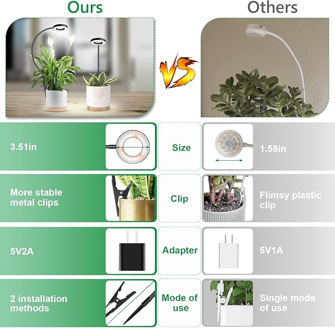 - Pot Clip Plant Light: This led grow lights have two installation methods; They can not only be clamped on the edge of pots, desktops or plant stands, but can also be inserted into the soil, making them flexible to use and not limited by scenarios.