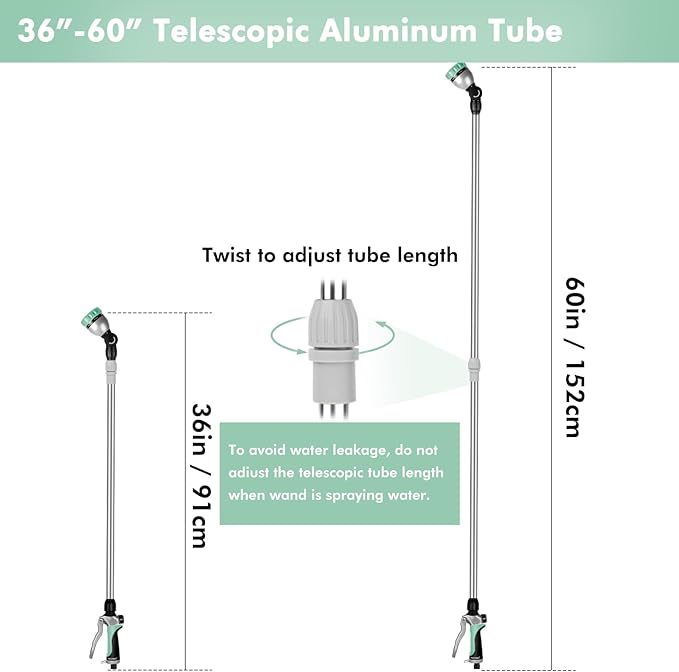 - 3'-5' TELESCOPING WATERING WAND – With the long aluminum alloy telescopic tube, this water wand length can be extended from 36 to 60 inches. The 180 degree ratcheting head can also help you to reach hanging baskets, shrubs, roofs, windows and those hard-to-reach areas in your lawn and garden.