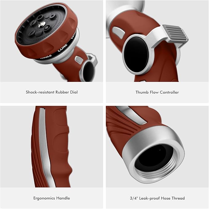 - 【Heavy Duty Metal Hose Nozzle】Constructed with premium zinc-alloy material, this hose nozzle sprayer is solid & strong to resist daily drops and shocks. The bronze powder painting, TPU coating and rubberized bezel dial can enhance durability & flexibility and withstand hard impacts & heavy force. A long-lasting garden hose nozzle you can count on many years.