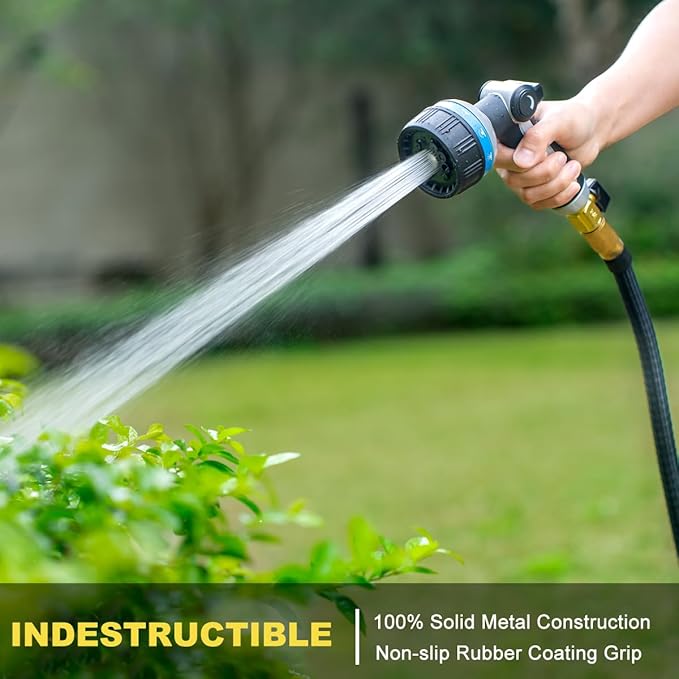 - HEAVY-DUTY GARDEN HOSE NOZZLE: The nozzle gun body is constructed with zinc-alloy material, solid & robust to resist rust, corrosion and wear. The shock resistant rubberized bezel dial can enhance durability & flexibility and withstand hard impacts & heavy force in daily drops and shocks. It is much stronger, more durable and long-lasting than plastic water nozzles.