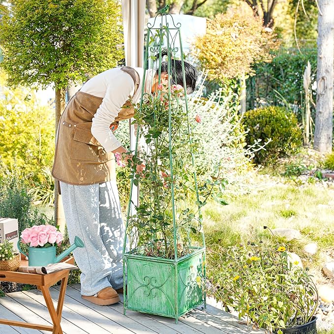 - All-in-One Garden Obelisk with Planter Box – 5-foot tall decorative metal trellis with integrated square planter, perfect for supporting climbing plants in small spaces like patios, balconies, and garden beds.