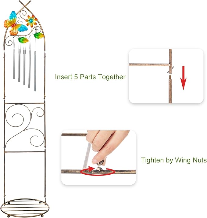 - Elegant Design: This plant pot stand features a charming trellis decorated with vivid colorful butterfly, flower and leaves for climbing plants and a robust bottom holder for flower pots. Besides, the wind chimes make beautiful sounds when a blows through