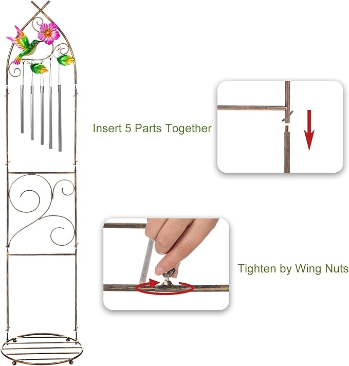 - Elegant Design: This plant pot stand features a charming trellis decorated with vivid colorful Hummingbird, flower and leaves for climbing plants and a robust bottom holder for flower pots. Besides, the wind chimes make beautiful sounds when a blows through