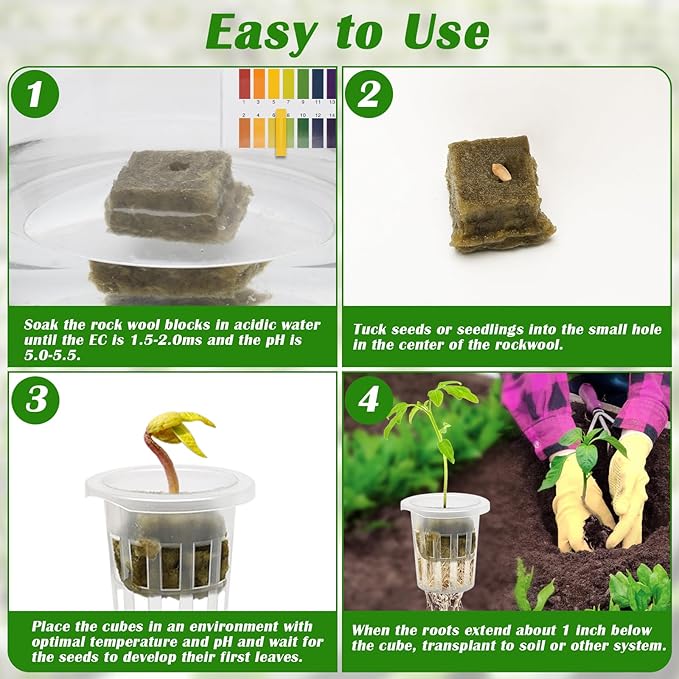 - Easy to Use: Cut the rockwool into cubes, soak it in acidic water with a pH of 5.5-6.5, put in seeds and put it in the net cup, wait for the roots to take root, and transplant when the roots penetrate the net cup about 1 inch