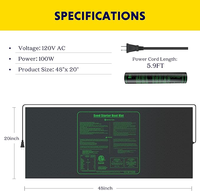 - Heating pad specifications: Size: 48*20 Inch; Wattage: 100W; Voltage: 120V; Material: PVC;Protect cold-sensitive plants and improve plant survival rate