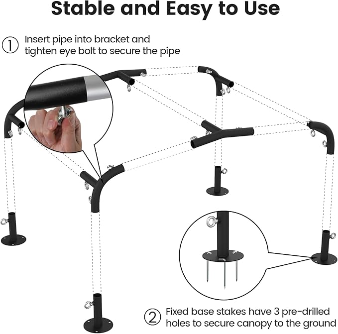 - Stable and Easy to Use: The carport frame tubing is equipped with 12 ground spikes to better fix base stakes, no need to worry about your canopy falling apart; this canopy frame parts can quickly assemble a 4 leg frame without complex tools