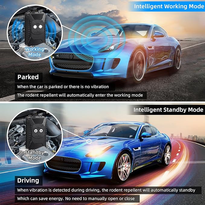 - Smart Detection Features: The ultrasonic rodent repeller for car includes a power-on self-test and vibration detection, automatically switching to standby mode while driving and activating 5 minutes after parking to protect your vehicle from rodents