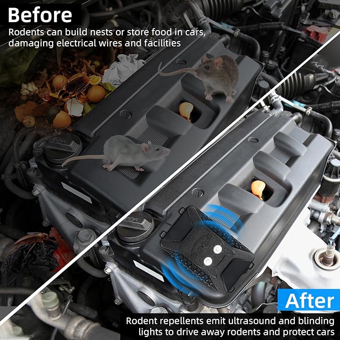 - Advanced Frequency Conversion: Car rodent repellent under hood uses frequency conversion technology, emitting fluctuating ultrasonic waves and strobe lights. This combination is effective in deterring rodents from cars, RVs, and trucks by disrupting their senses