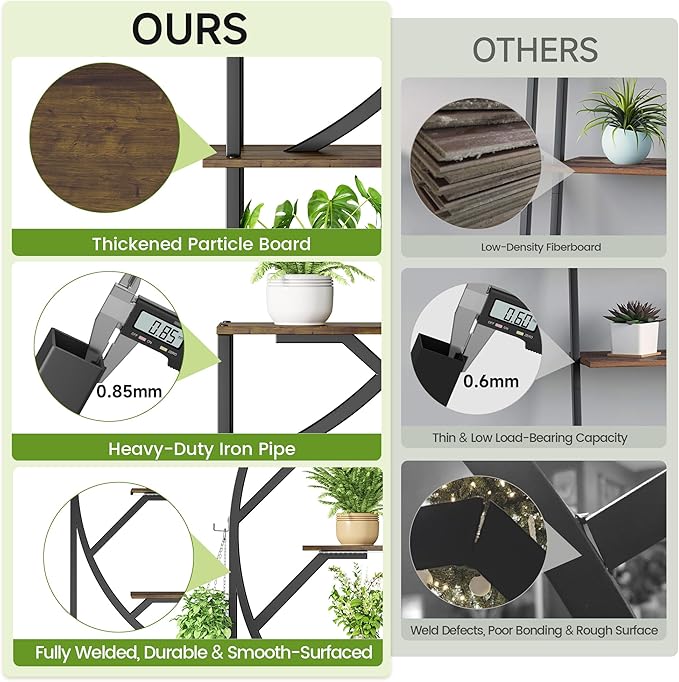 - 【Heavy-duty Iron & Fully Welded】Our plant shelf is made with 0.85mm thick iron pipes, while other plant holders are made with 0.6mm iron pipes. This makes our metal plant stand sturdier, more durable, and capable of supporting more weight. The joints of the iron pipes are fully welded, ensuring no weak or missed welds. After welding, we grind off the weld points to ensure the surface of the iron pipes is smooth and free of burrs.