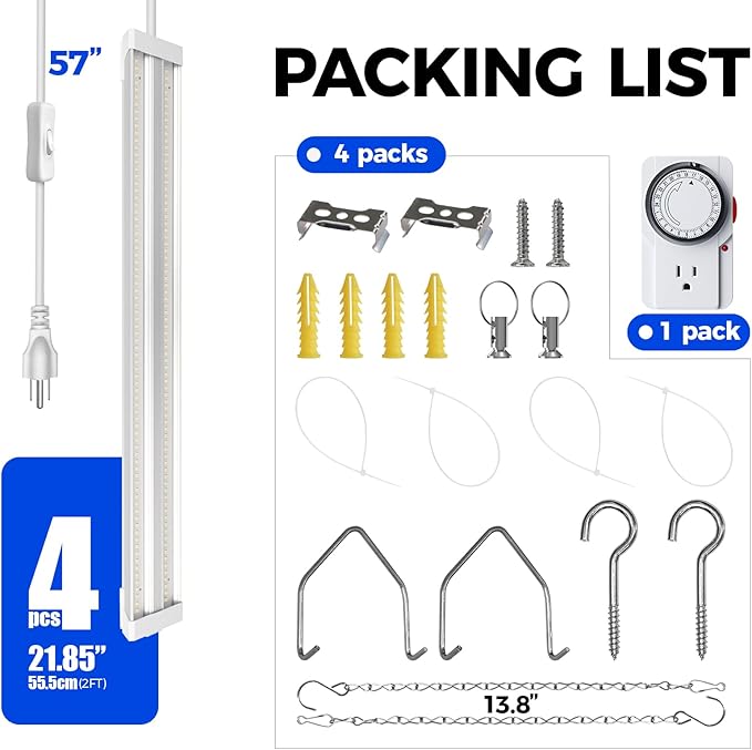 Barrina TX36 2FT Grow Light for Indoor Plants, 144W(4 x 36W, 800W Equivalent), High PPFD, 5000K Full Spectrum, Mechanical Timer, Hanging Grow Lights for Seedings, with On/Off Switch, Linkable, 4 Packs