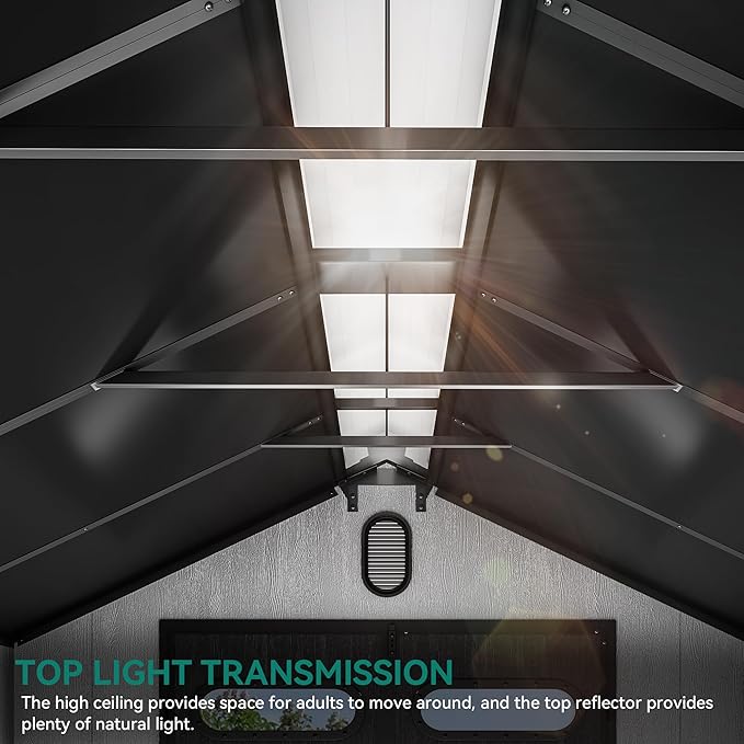 - Air-Ventilated and Light-Transmissible: The lockable door design offers anti-theft protection; Skylights and semi-transparent side windows facilitate natural light while louvered windows promote air circulation to prevent moisture build-up; A sloped roof effectively drains water to achieve extended durability