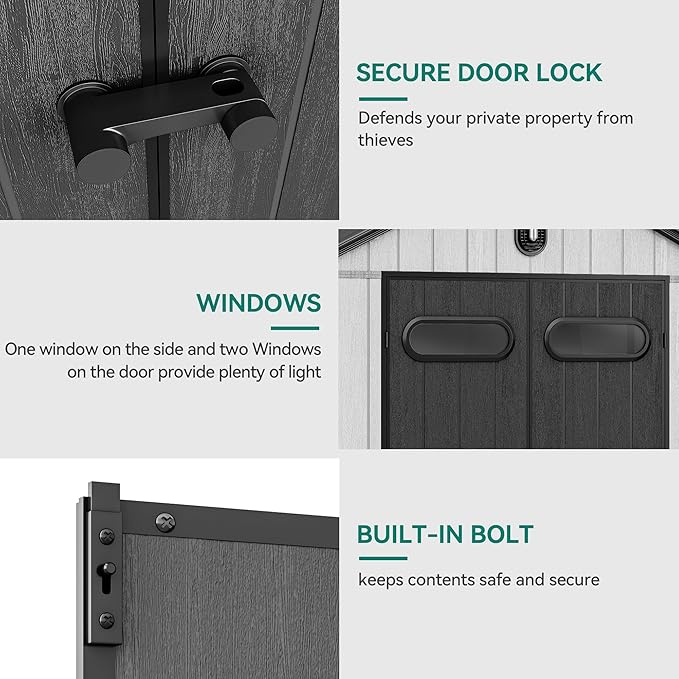 - Heavy-Duty Floor: The backyard storage shed comes with a 16mm thick double-layer resin floor for added protection, ensuring stored items stay clean and dry; Durable PVC flooring withstands abrasion, supports heavy equipment, and enhances stability on flat surfaces