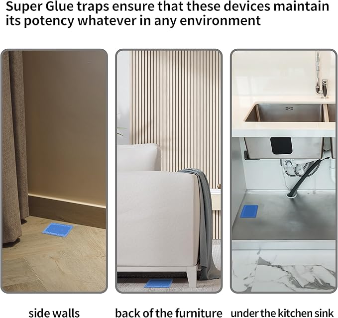- Where to Place: We suggest you position sticky traps along active rodent and insects runways, such as along walls, under large kitchen appliances, in cupboards, and other areas where rodents and insects travel. Be sure to fit the glue trap flush against a wall where they will run over and stick to it.
