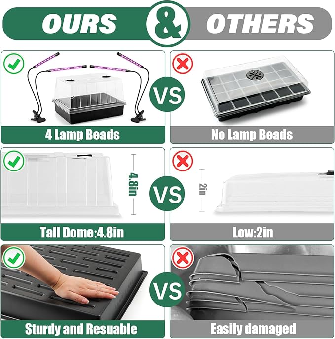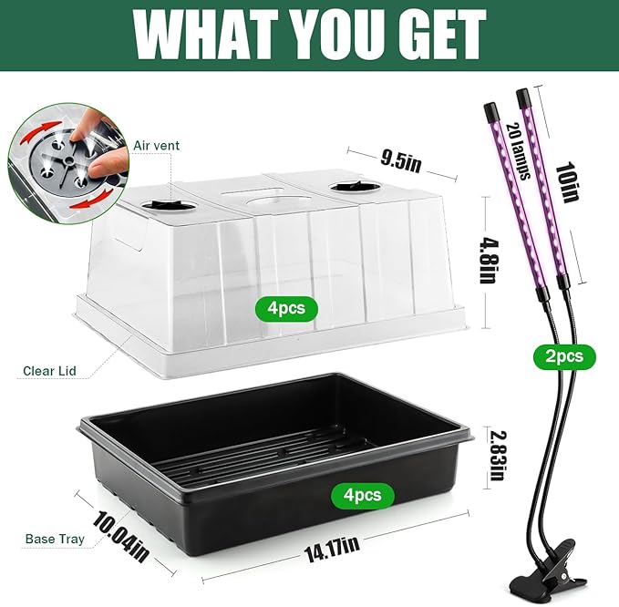 - 【Complete Indoor Seed Starter Kit with Grow Lights】Includes 4 durable seed trays with 5" tall humidity domes and 2 dual-head grow lights (4 heads total). Ideal for beginners and experienced gardeners to grow vegetables, herbs, or flowers indoors year-round. Everything you need to start seeds successfully in one easy-to-use set.
