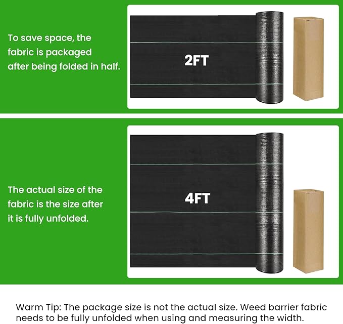 - ๐๐ซ๐๐ฆ๐ข๐ฎ๐ฆ ๐๐๐ญ๐๐ซ๐ข๐๐ฅ: This one is 4ft wide and 300ft long. Made of high quality polypropylene (PP) material, our weed barrier can withstand harsh weather conditions, durable and anti-aging. Resistant to wear and tear over long time use, it offers long-lasting protection for your garden