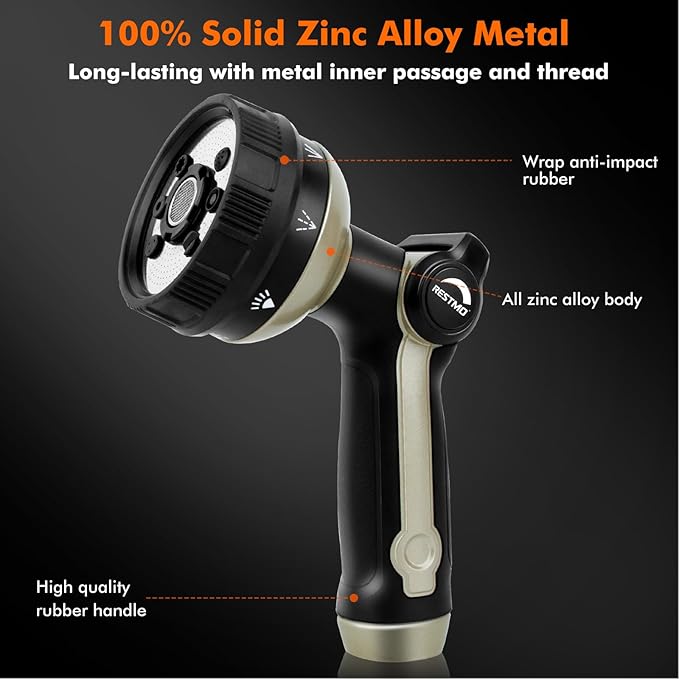 - Heavy Duty Metal Hose Nozzle: Constructed with premium zinc-alloy material, this hose nozzle sprayer is solid & strong to resist daily drops and shocks. The bronze powder painting, TPU coating and rubberized bezel dial can enhance durability & flexibility and withstand hard impacts & heavy force. A long-lasting garden hose nozzle you can count on many years.