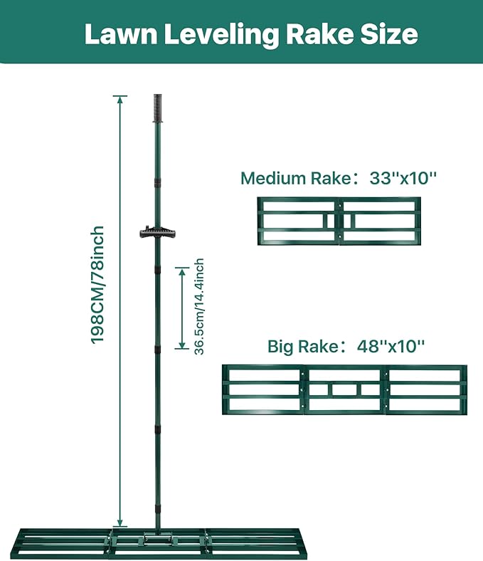 - Upgrade Structure & Multi-Function: 48x10'' lawn Leveling Rake is designed to tackle a variety of garden tasks, including distributing application materials, removing stones, breaking up small clods of sand or loam, mixing soil with fertilizers, and smoothing the soil for effortless planting. Mutil-function lawn rake makes planting and gardening much easier