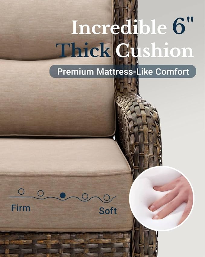 - 6-Inch Thick Seat Cushion: Unlike the 4" cushions most outdoor sets use, our 6-inch cushions with high-density 28D foam offer the ideal balance of softness and support. Quick-rebound core keeps its shape, while added cotton layers and 3D backrest fill deliver extra comfort and pressure relief (Note: Ottoman cushion is 3.5")