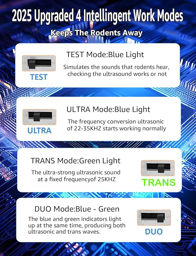 - Pet safety and four working modes:Harmless to your family and most pets (such as dogs and cats). We recommend confirming the pest repellent device's safety for all your pets before use,as some pests may grow accustomed to the sound.The device offers 4 modes:TEST Mode for ultrasonic verification,ULTRA Mode for common pests,TRANS Mode for larger rodents,and DUO Mode for combined ultrasonic and pressure wave protection.This ensures your living space is fully protected from pest invasions