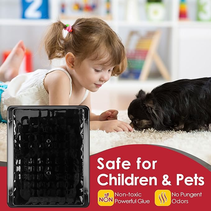 - [Non Toxic Glue]: The jumbo mouse traps use glue that can withstand the cold and wet environments; The sticky mouse trap is made of plastic and glue material, these glues are non toxic, and harmless to your children and pets; They are safe for use inside your house; Mice instantly stick to glue upon contact, stay confined to trap surface and cannot escape, but not an immediate kill