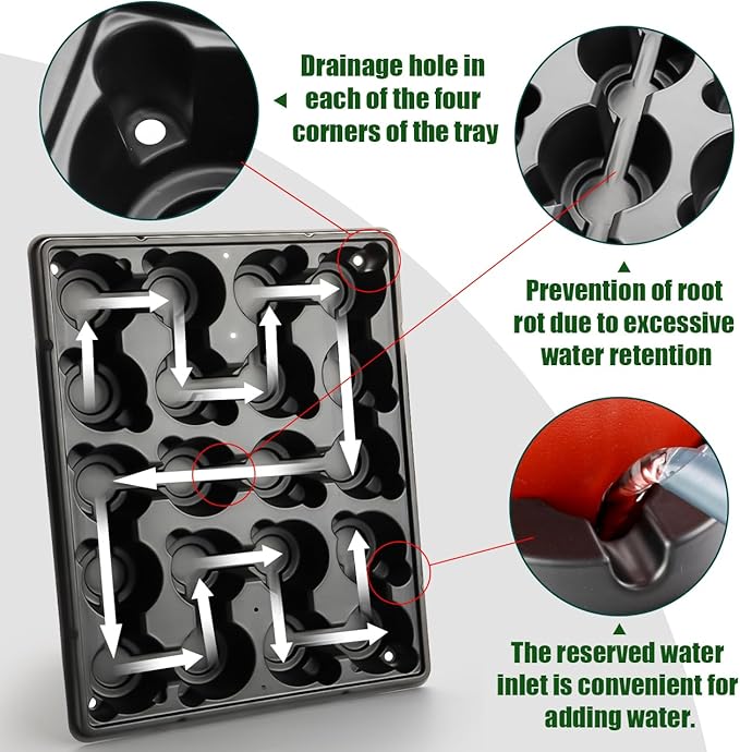 - 【Improved Airflow for Healthier Roots】Each compartment in the seed starting trays features a 0.2-inch gap between the bottom of the pot and the base of the plant tray, promoting better airflow to the soil. This helps increase soil aeration and prevents waterlogging, contributing to stronger, healthier root systems.