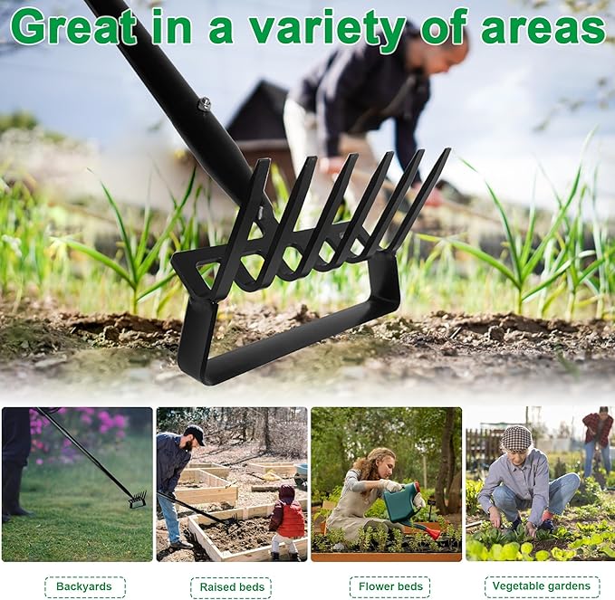 - 【6Tines/8Tines Available】We offer 6 tines and 8 tines metal rake. Compared to 4 tines, the tines spacing is smaller and tighter. It won't fail to remove debris because the tines are too wide apart. The hoe is also longer for more efficient weeding. Garden hoe and rake will easily go through most soil types to dislodge weeds. 2-in-1 yard rake and hula hoe is a great tool for gardening tasks such as weeding, digging, and loosening soil.