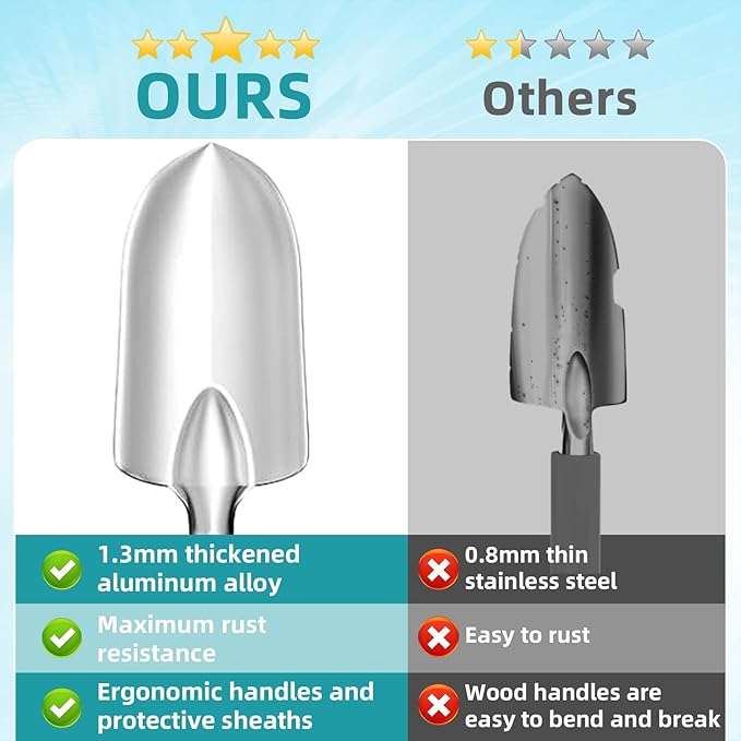 - Durable & Rust-Resistant: Constructed from heavy-duty aluminum alloy, meticulously crafted for durability and longevity. From the reinforced blades to the rugged handles, every component of gardening tools kit is designed to withstand the rigors of regular use in the garden. Whether you're working in dense clay or sandy soil, our gardening hand tools are up to the challenge, ensuring years of reliable performance season after season.