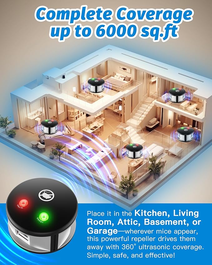 - [360° Coverage for Immediate Impact] -- The innovative design provides three-way sound emission, delivering 360° coverage to disrupt and drive away mice and similar intruders in any indoor space. Results with full effectiveness achieved in 3–4 weeks.