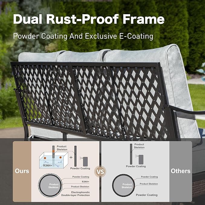 - 【ALL WEATHER HEAVY-DUTY FRAME】This metal backyard furniture set is made of high-performance E-COATING and POWDER-COATING dual rust prevention techniques that are All weather resistant, anti-rust, and easy to clean, with no special care needed. That patio conversation set has a heavy-duty wrought iron metal frame, The single chairs could support up to 350 lbs weight, the 2-seater sofa supports 700 lbs and the 3-seater sofa supports 900 lbs
