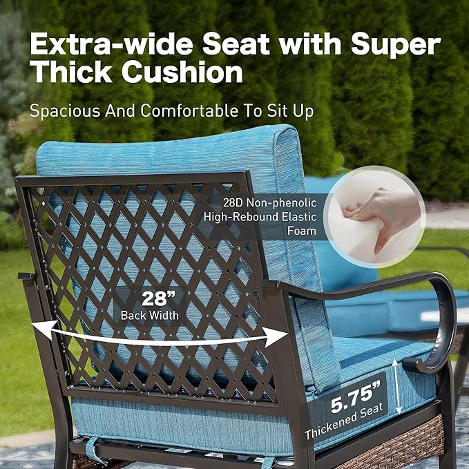 - 【LUXURIOUS 5.75" EXTRA THICKER CUSHION】This patio furniture set comes with a 5.75-inch extra thick soft cushion filled with 28D density phenol-free sponge with high resilience for comfortable sitting. Enjoy a comfortable ride even if you use it for a long time, and say goodbye to the worries of collapsing seat cushions