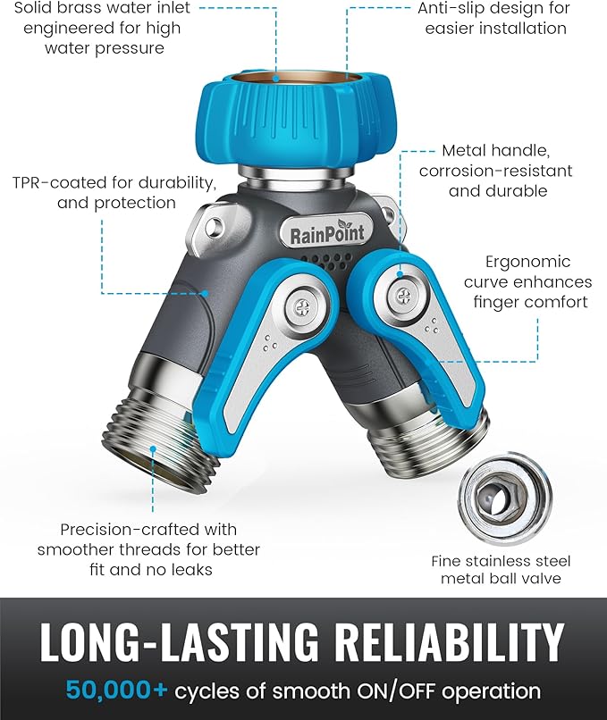 - STAINLESS STEEL BALL VALVE: This two way hose splitter valve is made of high-quality metal that withstands up to 200 PSI without cracking. 5x more durable than plastic valves and operates smoothly even after 50,000+ on/off cycles, offering long-lasting reliability.