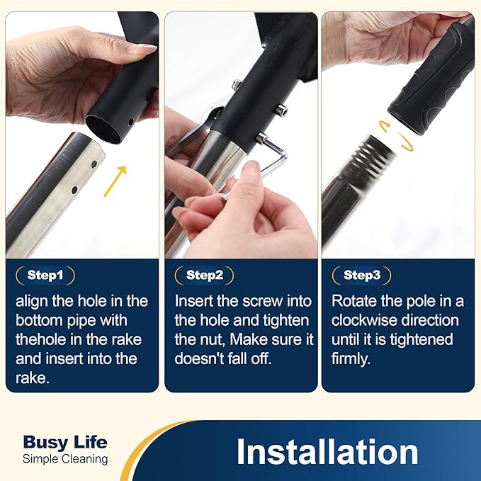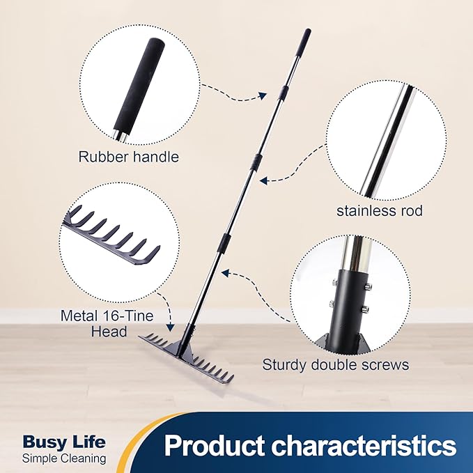 - Thatch Rake 15.7" Steel Lawn Thatching Rake: The thatch rake is easy to assemble. The handle of the thatch rake for the yard is made up of multiple sections. You simply rotate and tighten the required number of handle sections, and you can adjust the length by connecting a different number of poles, making it suitable for people of different heights. The connection between the rake head and the rod can be easily assembled using only the wrenches and screws provided in our package