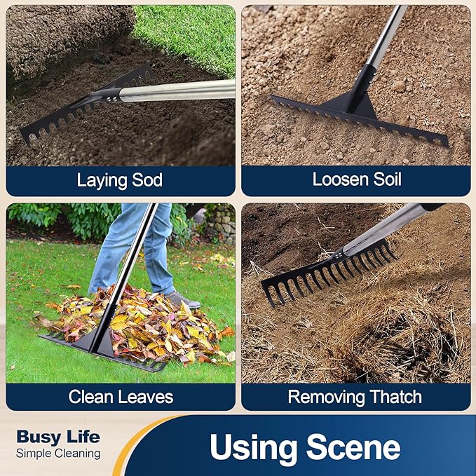 - Thatch Rake 15.7" Steel Lawn Thatching Rake: The grass thatching rake is made of good-quality sturdy stainless steel, provides reliability and long-term usability. The end of the pole is equipped with a rubber anti-slip grip, which is good for long hours of yard work and improves gardening efficiency. It is a good garden rake for gardeners, it will provides you with a comfortable experience