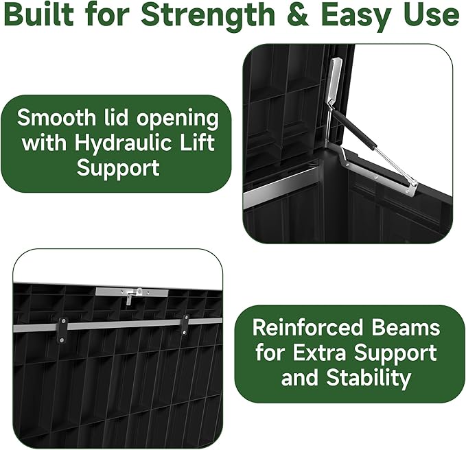 - ENHANCED SAFETY FEATURES - The EasyUp storage box features a hydraulic rod that allows for smooth lid opening and closing, reducing the risk of accidental pinching. The built-in locking mechanism adds an extra layer of security, making it ideal for safeguarding outdoor valuables.