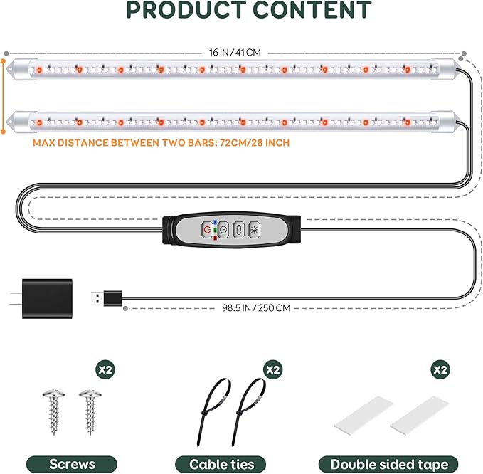- [Easy to Use & Flexible Installation ]-The grow bar lights come with 4 cable ties, 4 screws, 4 double-sided tape. There have 3 ways to install the bars. You can use double-sided tape to stick to the surface or use the zip ties to fix the bars on the shelf or fix them with the screws. It can be easily installed on any surface such as shelves, walls, plant stands, or any other fixtures in the home space.