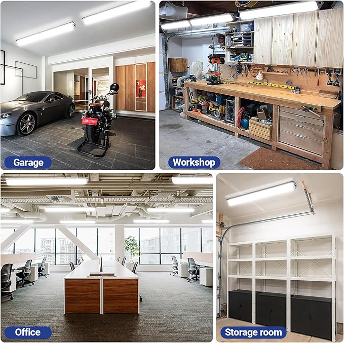 - ✔ WIDE APPLICATION - With lightweight and compact design, these 4ft led ceiling lights are ideal for both commercial and residential buildings for wide or narrow spaces. They can be widely used for garage, kitchen, shop, office, laundry, workbench, workshop, closet, carport, gym, storage room, attic, barn, pantry, shed, patio warehouse, basement, utility room, equipment room, cellar, church, play room, hallway, other work area and replacing old fluorescent versions.