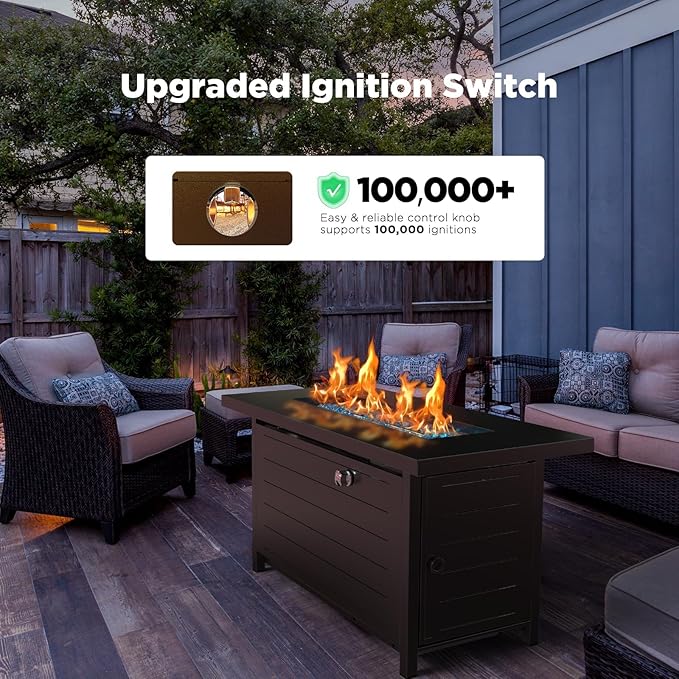 - Reliable Ignition System: The upgraded ignition switch is engineered to withstand up to 100,000 ignitions, ensuring long-lasting performance for many warm nights. Simply push in and twist the control knob to ignite the gas fire pit, then push in and adjust the knob to set the flame to your preference.