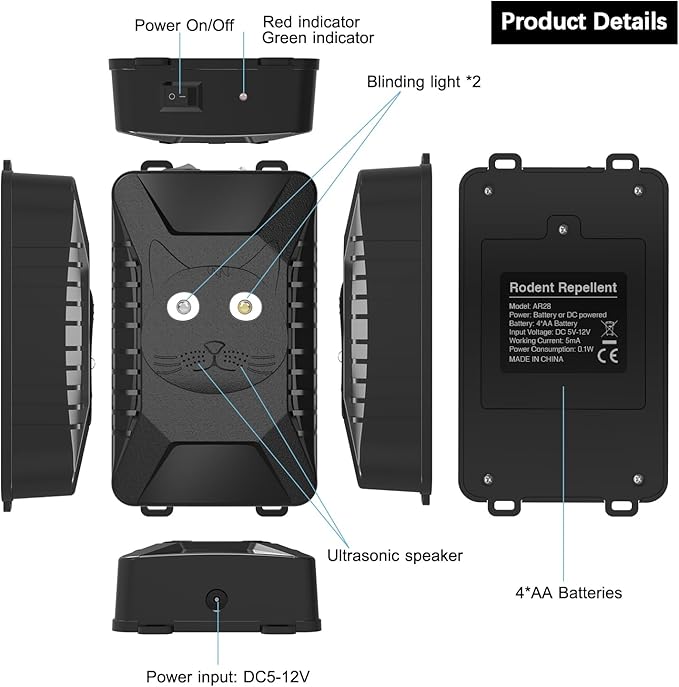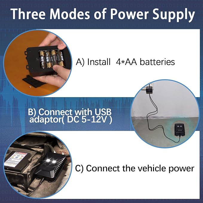 - THREE POWER SUPPLY MODES: Rat deterrent for car engine have three charging modes are provided for easy use. 1: Use 4 AA batteries, 2: Use a USB cable to connect to a 5-12V adapter for charging, 3: Use a DC cable to connect to the power supply under the hood of the car
