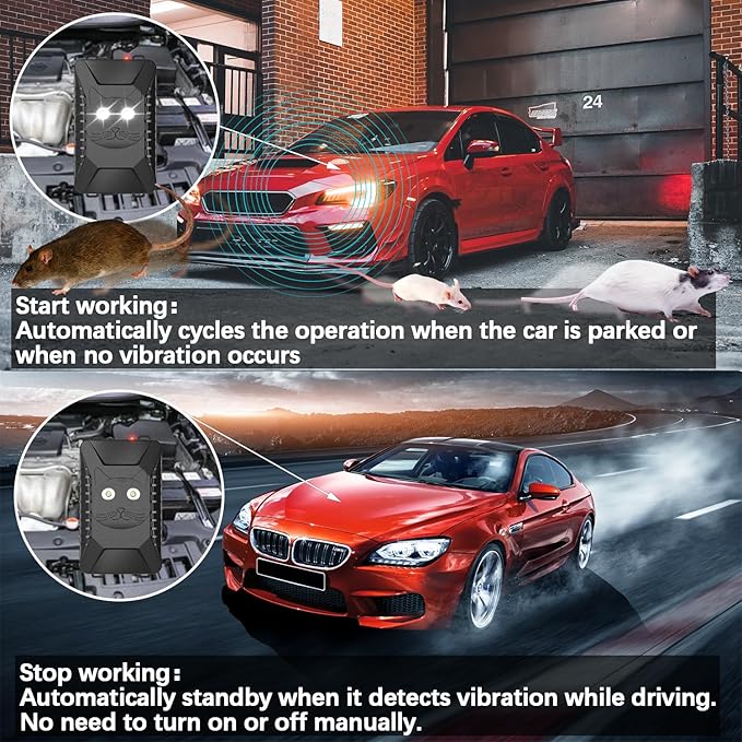 - INTELLIGENT VIBRATION SENSING: When a vibration signal triggers the circuit (the car starts), the mouse repeller stops working and the red indicator light is always on. The machine resumes working after 90 seconds when the working environment is stable (no more vibration)
