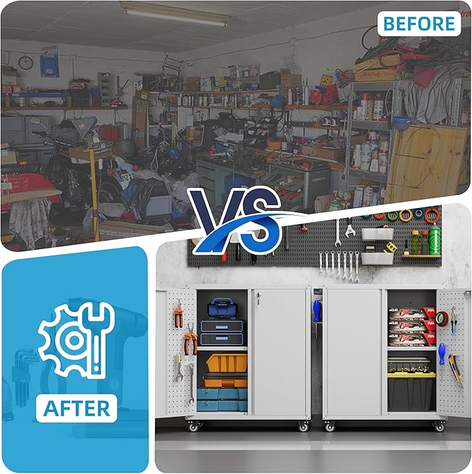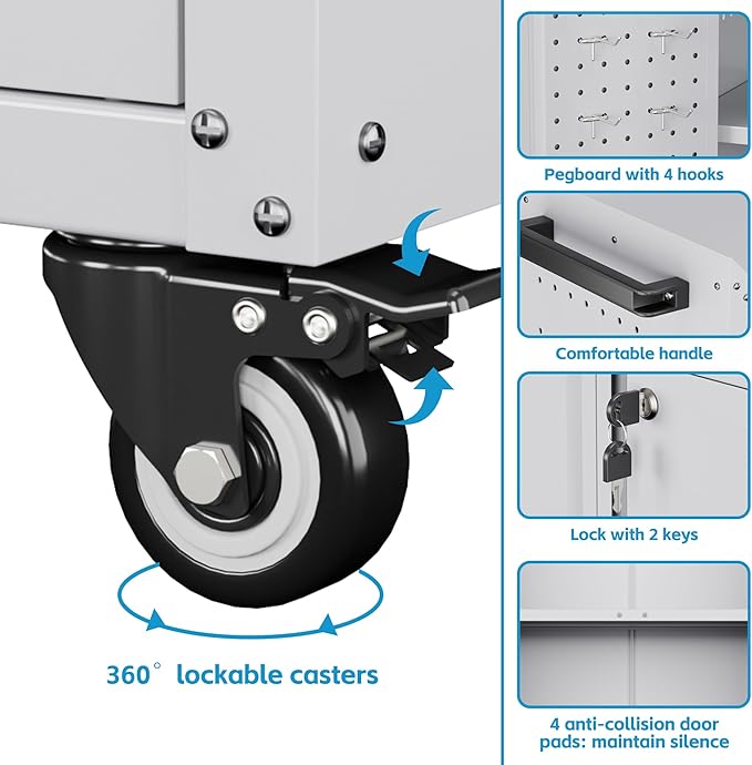 - Wheels and Lockable Doors:Garage cabinet on wheels equipped with 4 detachable and lockable casters, this cabinet glides effortlessly across all surfaces. Heavy-duty wheels protect your floors from scratches, while corner protectors add an extra layer of security.This cabinet comes with two keys, which can be stored separately and used by multiple people.