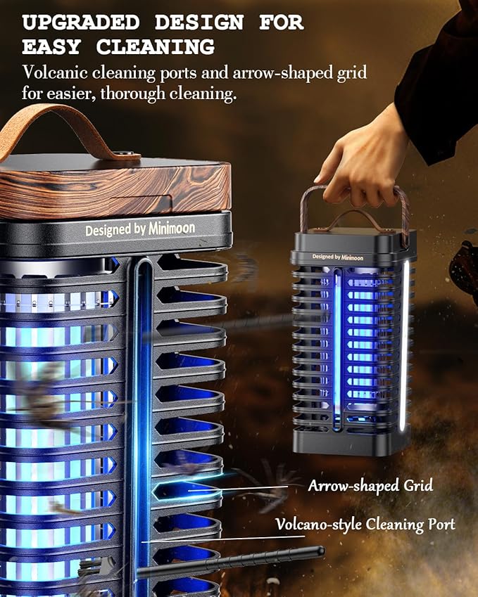 - 【Upgraded Easy-Clean Design】The Minimoon bug zapper Features a unique volcano-shaped cleaning port for deep, thorough removal of mosquito residue. Combined with an arrow-style mesh for smooth side-to-side cleaning, covering more area in less time—effortless maintenance