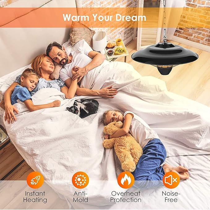 - Silent & Fan-Free Heating: The infrared hanging heater with fanless design ensures quiet operation, creating a peaceful environment for relaxation or work while delivering efficient heating for any setting