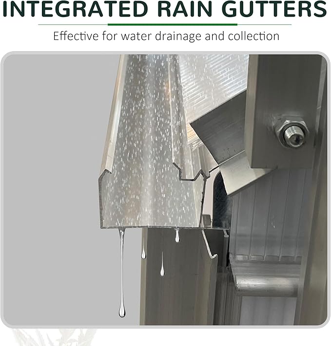 - Functional Features: Access this backyard greenhouse easily through a sliding door and adjust the five-level windows for optimal ventilation. It also includes built-in rain gutters for effective water drainage.