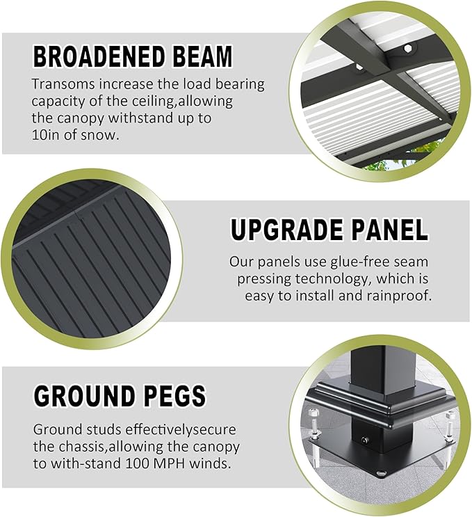 - 【UPGRADED RAINPROOF CANOPY】Different from the carports on the market,our canopy adopts a vertical stripe design, which is more conducive to the drainage of rainwater, canopy is installed with a press seam design to prevent rain leakage.