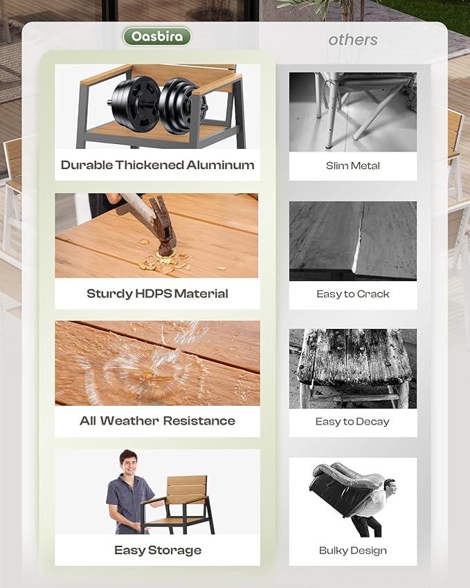 - Premium Material: This outdoor table and chairs set is crafted with high-quality aluminum frame and HDPS material. The aluminum frame features a double-layer design, engineered for exceptional stability and load-bearing capacity. The HDPS tabletop offers a natural wood-like finish, combining elegance with durability and weather resistance