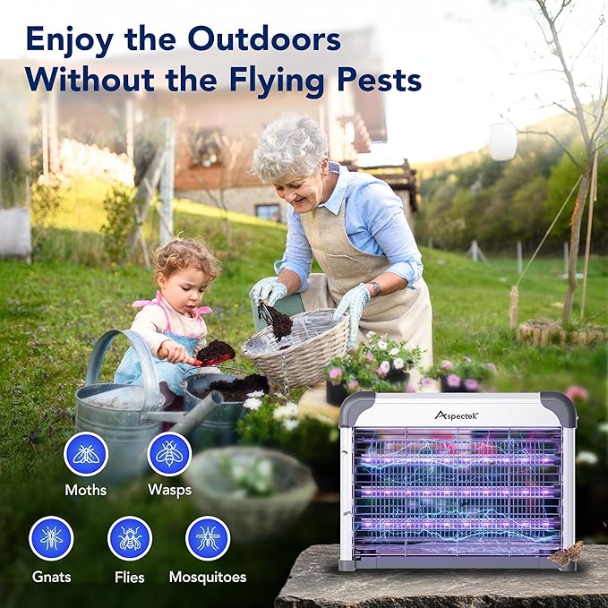 - Effective Indoor Mosquito Control – The Aspectek LED Bug Zapper eliminates flying insects such as mosquitoes, flies, moths, and gnats using a high-voltage electric grid, without the use of sprays, chemicals, or odors. A durable outer safety mesh prevents accidental contact, making it safe for households with children and pets.