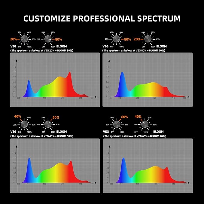 - Dual Knob Dimming for Precision Control: The full spectrum grow light features separate dimming knobs for VEG and BLOOM modes, allowing you to adjust brightness and spectrum independently (0-100%). This eliminates the need to constantly change the hanging height or run the light at full power, saving energy and ensuring your plants receive the ideal light for each growth stage.