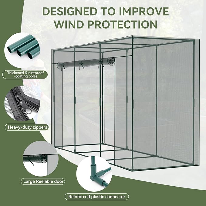 - Durable Mesh and Steel Frame: high-density polyester plant netting, which is tear-resistant and allows air circulation and water penetration. The garden bed cover adopts thickened steel tube frame to prevent rust, stabilize and prevent deformation, keep your plant safe , and prevent any birds and small animals