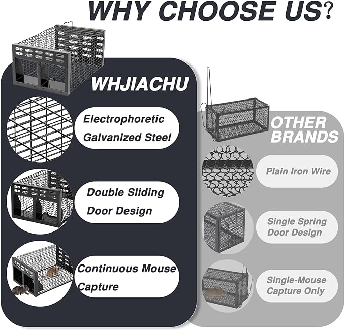 - 【Enhanced Three-Layer Construction】 This upgraded mouse trap features a reinforced three-layer structure with a steel core, protective coating, and advanced electrophoresis finish, which helps prevent rust and corrosion. The high-strength material effectively stops mice from chewing through the cage, ensuring long-term durability and reliable performance.